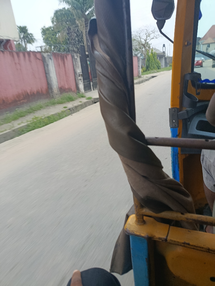 The image depicts a daytime scene from the interior of a moving tricycle, likely in Warri, Nigeria. The perspective is outward-facing towards the right side of a paved road. In the immediate foreground, a dark brown, crumpled fabric component of the tricycle's interior structure extends vertically, partially obscuring the view. To the right, a yellow and blue metal frame of the vehicle is visible, along with a rearview mirror mounted high. The bare leg of an occupant, wearing light-colored shorts, is partially visible on the far right. In the lower left, a person's foot, clad in dark clothing, rests on the vehicle's floor. The road surface, occupying the left and central midground, is light grey asphalt with horizontal motion blur, indicating the vehicle is in motion. To the left of the road, a concrete curb separates it from a narrow strip of unkempt grass. Beyond the grass, a reddish-pink rendered concrete wall with regularly spaced grey concrete pillars extends into the distance. Sections of the wall are topped with razor wire. A dark, ornate metal gate is visible along this wall. In the background, behind the wall and vegetation, various trees including palm trees are present. Further down the street on the right side, another residential area is visible, characterized by white walls, green shrubs, and a bare-branched tree. A tall, slender utility structure, possibly a water tank or mast, stands against the sky. A red sedan is seen in the distance on the right side of the road, traveling in the opposite direction. The sky is overcast.