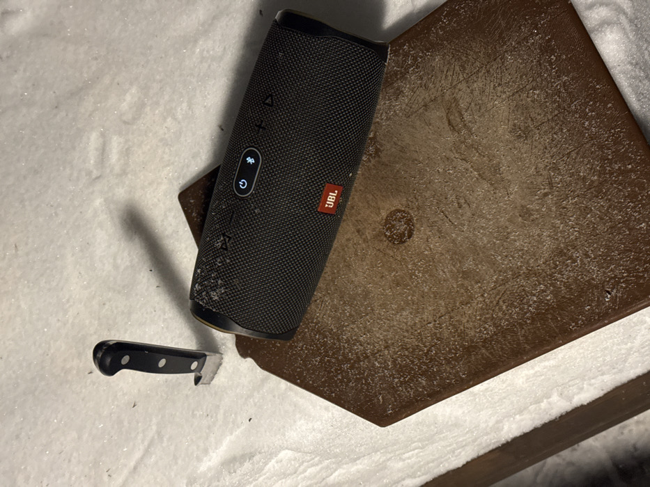 A black JBL speaker stands beside a brown cutting board and a small knife in the snow