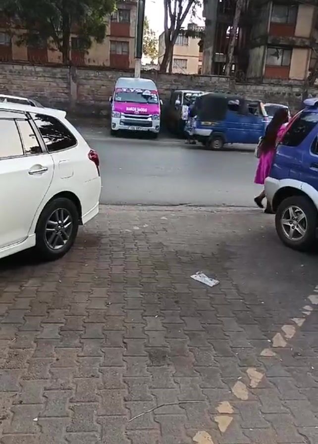 street scene in what appears to be an urban area in Africa. Several vehicles are present, including a white station wagon parked on the left, a blue SUV parked on the right, and a number of vans or small buses in the street. People are standing and moving around the vehicles in the street. A woman wearing a pink dress walks on the sidewalk toward the blue SUV. A motorcycle drives by. The street is paved and the sidewalk is made of brick pavers. There are apartment buildings and trees in the background. The sky is overcast.