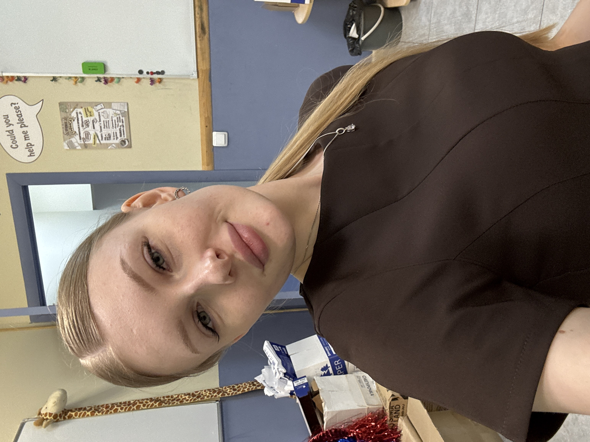 A person with fair skin, blonde hair, and green eyes is shown from the shoulders up. She is wearing a brown garment. The background includes a whiteboard with a speech bubble that says "Could you help me please?" and various other items. There are boxes stacked near the bottom of the image, as well as a small plush giraffe on a shelf. The location is Perm, Russia.