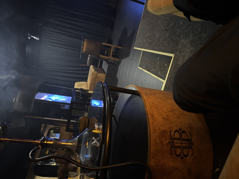 An indoor scene, likely a lounge or bar, is depicted with dim lighting and a smoky atmosphere. The location is identified as **TRIP Bar & Lounge, Sofia, Bulgaria**, based on the distinctive stylized "TR" logo visible on the furniture. In the immediate foreground, a person's legs, clad in dark trousers, are visible, indicating the photographer's seated perspective. Directly in front of this perspective, a tall, elaborate hookah with a clear glass base, a metallic silver stem, and a black hose stands on a round table. The table features a black glass top and a wide, cylindrical base covered in a textured brown material, which prominently displays the dark, stylized "TR" logo. On the table's surface, next to the hookah, are a small yellow plastic hookah tip and a piece of white debris, possibly a wrapper. The midground reveals a seating area with various furnishings. A low, light brown upholstered bench or sofa is positioned against a wall. Nearby, a dark wooden table with dark chairs is visible. Further back, a tall bar stool with a brown, leather-like seat is present. To the left, a narrow, vertical digital display screen exhibits a luminous blue, abstract image. Above, dark speakers are mounted on the walls. The background is predominantly dark, featuring black stage-like curtains along the rear wall. The floor transitions between different dark materials, with some lighter contrasting lines, possibly indicating changes in floor level or carpeted sections. The overall environment suggests a relaxed, evening setting characteristic of a hookah lounge or bar.