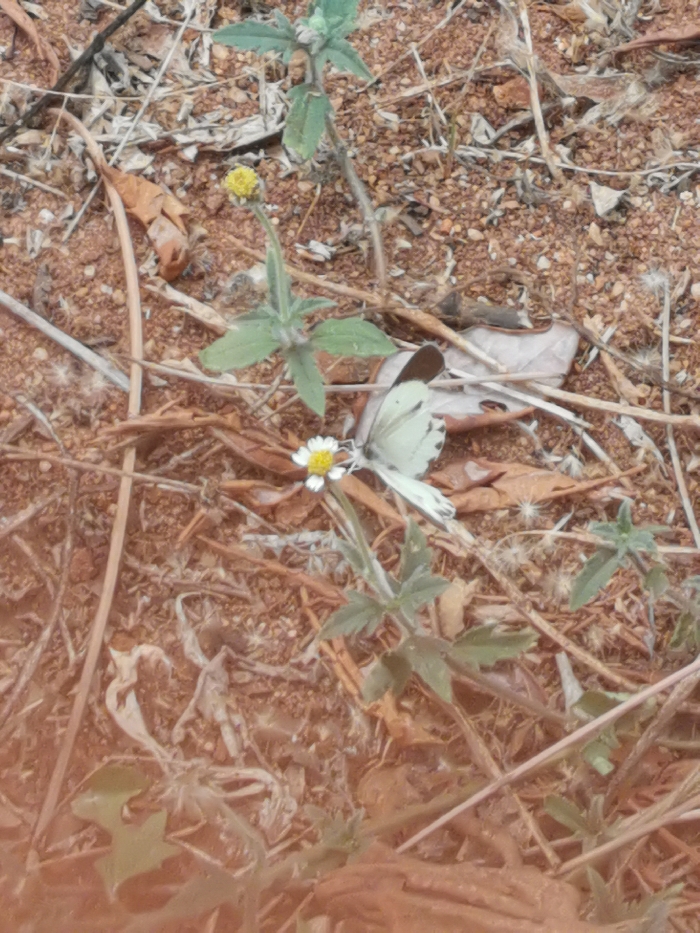 In Owa-Aliosimi, Nigeria, an outdoor scene is depicted from an elevated perspective. The ground consists of reddish-brown granular soil, densely covered with dry, light-brown plant matter, including numerous thin twigs and desiccated leaves. Sparse green vegetation is present, featuring several small plants. A prominent green plant in the upper-left exhibits a single yellow flower bud on its upright stem. Below and to the right, a smaller green plant bears a white flower with a yellow pistil. A butterfly, predominantly pale cream or white with distinct dark brown markings on the outer edges of its folded upper wings, is perched on this white flower, oriented with its head towards the right. No human subjects or artificial objects are visible.