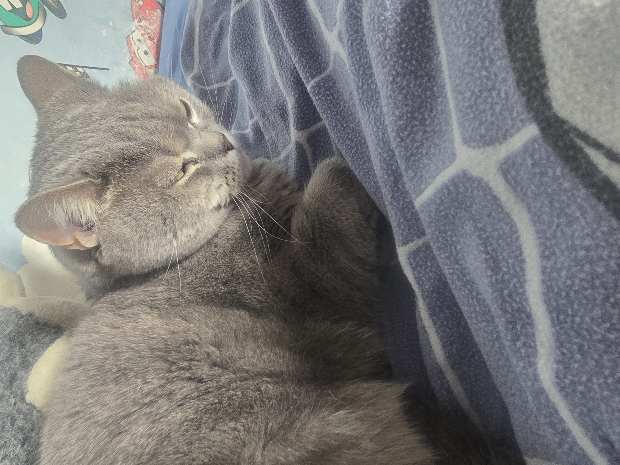 - "A grey cat lies curled up and sleeping on a bed or blanket with a blue and white patterned covering" by FM-NMWm63, licensed under CC BY 4.0