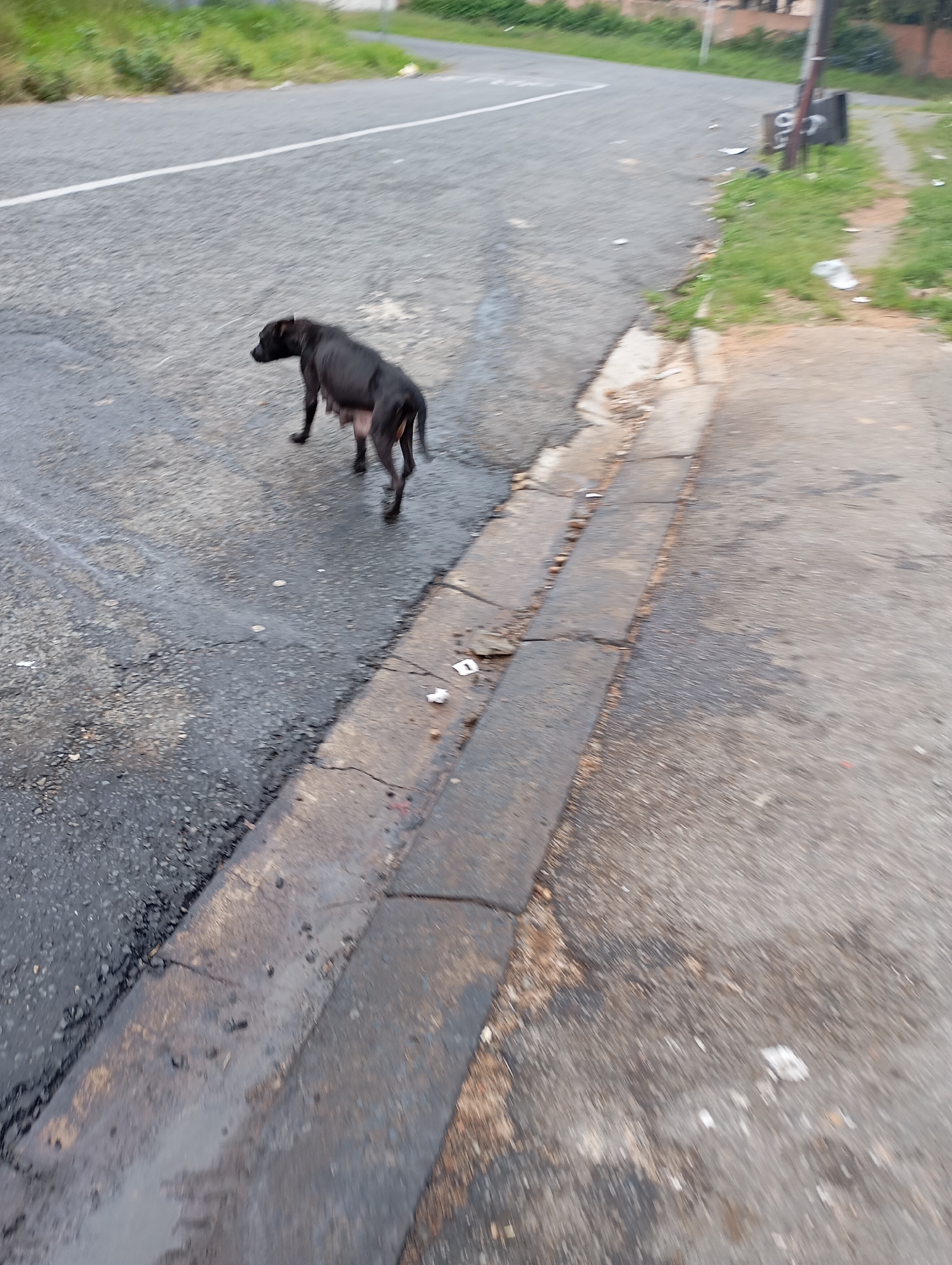 A black dog stands on a paved road in what appears to be a residential area. The road shows signs of wear and recent repair, with a patch of newly laid asphalt. A curb separates the road from a concrete sidewalk, which is partially visible in the lower right. To the right of the sidewalk is a strip of green grass, where litter is scattered. In the background, across the road, more green grass and a distant building can be seen. A sign or marker is located at the side of the road. The dog is the main subject of the image. The Johannesburg location is inferred from the style of roads, curbs, and vegetation typical of some residential areas in the city.