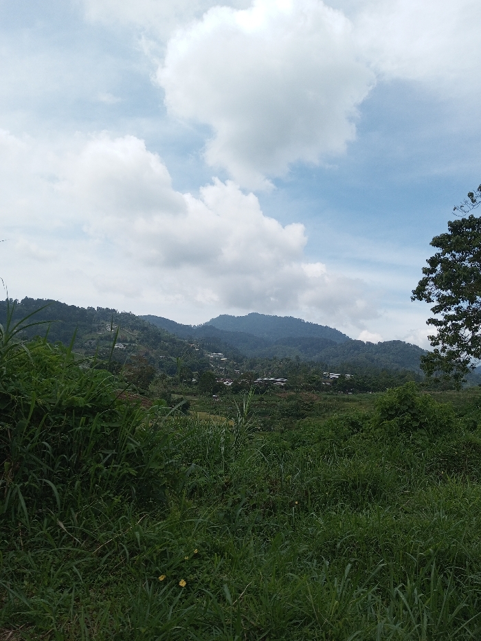 This image presents a panoramic view of a mountainous and vegetated landscape in Kandenuwara, Sri Lanka, captured under a partly cloudy sky