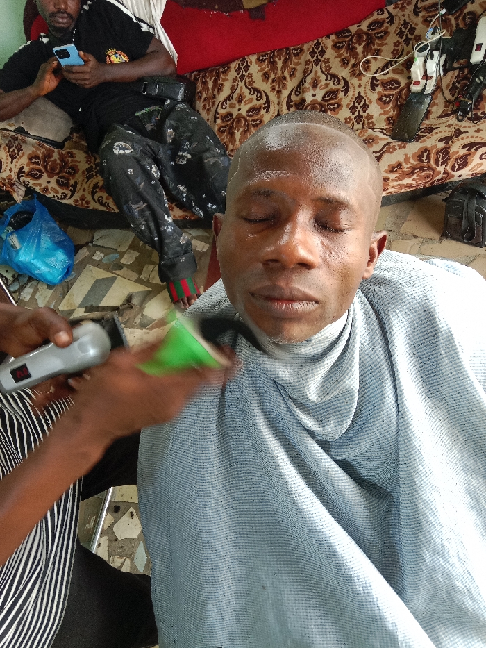 An indoor scene in Lokoja, Nigeria, depicts a barber actively grooming a client