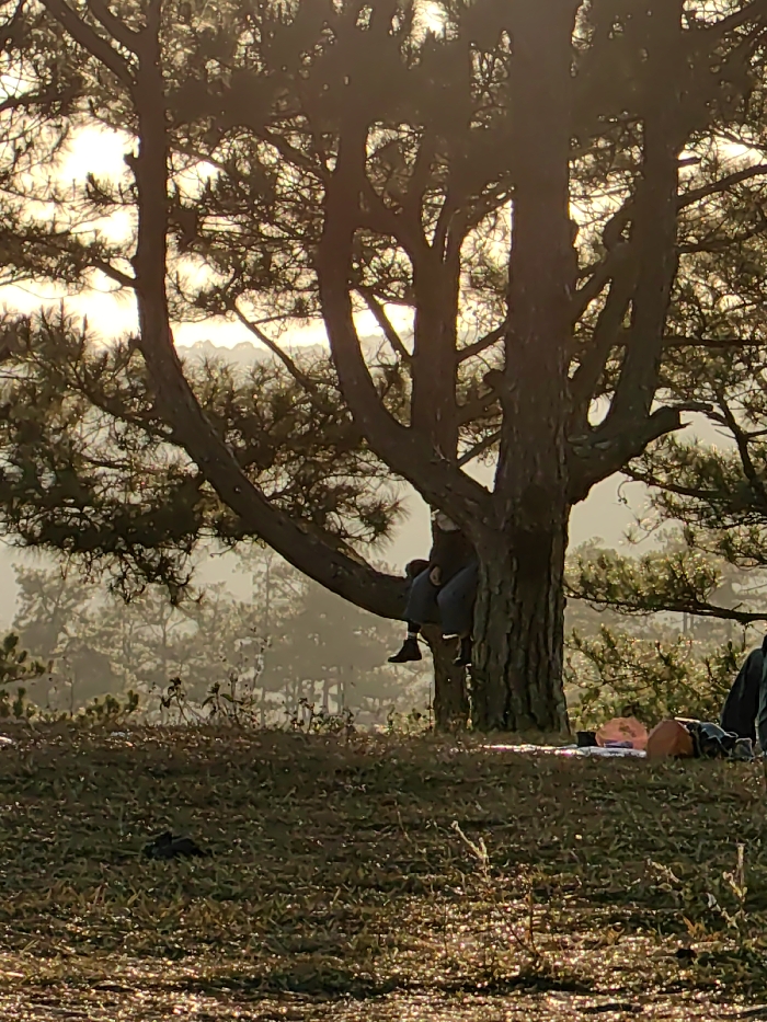 An outdoor scene in Lạc Dương, Vietnam, captured during sunrise or sunset, features a hazy landscape illuminated by a low sun creating backlighting and a golden hue. The foreground displays dry, sparse ground with some vegetation and scattered pine needles. A large, multi-trunked pine tree is centrally located. An individual is seated on a substantial branch of this tree, partially obscured by the main trunk, wearing a dark top, blue trousers, and dark boots. To the immediate right of the tree, on the ground, a light-colored ground covering is laid out, accompanied by an orange bag and several dark objects, suggesting a temporary resting or picnic setup. The background reveals a dense pine forest obscured by atmospheric haze, with diffuse light visible through the tree canopy.