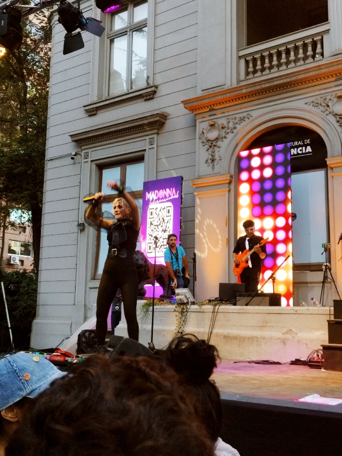 An outdoor live performance is underway in front of the Cultural Center of Providencia, Chile