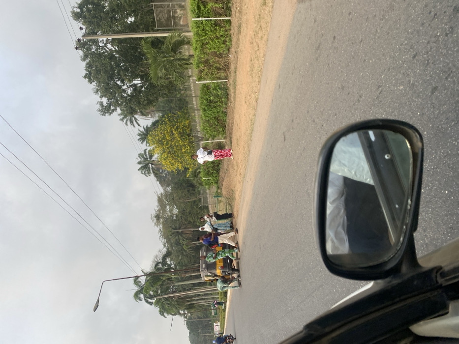 A roadside scene unfolds on a sunny day. A group of people stands by a "keke napep" three-wheeled vehicle, likely waiting for transport. One individual in a white top and patterned pants stands slightly apart. Lush greenery and trees line the road, creating a natural backdrop. The view is captured from inside a moving vehicle, as evident by the side mirror prominently displaying a blurred reflection of the car's interior. A utility pole stands along the roadside.