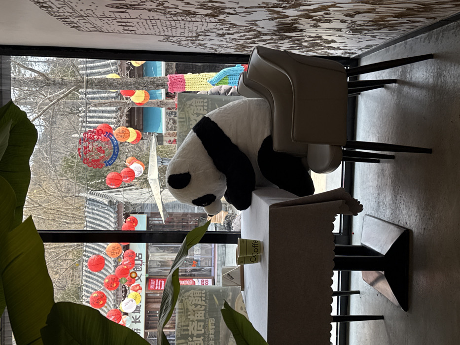The image depicts an interior view looking out through a large window onto a street scene in Huairou District, China. In the foreground, a large, black and white panda plush toy is seated in a light beige armchair at a table covered with a scalloped, light-colored tablecloth. Two light green cups, each labeled "CCoffee," are positioned on the table to the left of the panda. Another identical beige armchair is situated to the right of the panda, facing the table. A large green leafy plant partially obscures the upper left portion of the image. The wall on the right features a light-toned mural depicting architectural structures resembling a city skyline or section of the Great Wall. Through the window, an outdoor street scene is visible. Traditional Chinese-style buildings with dark, tiled roofs line the street. Numerous red and yellow lanterns are strung across the street and between buildings. A circular red and blue sign with Chinese characters and "HAPPY NEW YEAR 2023" is centrally displayed. Bare trees are visible, with a distant mountain or hill in the background, suggesting a colder season. A white patio umbrella is present, along with a brightly colored, multi-patterned knitted cover adorning a pole or tree trunk. A store sign on one of the buildings includes the characters "长城文创店" (Great Wall Cultural and Creative Store). The lighting indicates daylight conditions. No human figures are explicitly visible.