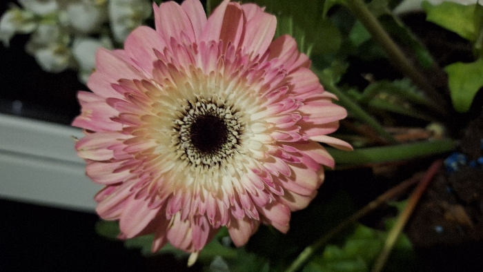 A close-up captures a pink gerbera daisy with a creamy white center and a dark, almost black, central disk. The petals are tightly packed and show variations in pink hues. Background elements include greenery and hints of other white flowers, suggesting a bouquet or floral arrangement. The lighting casts shadows that emphasize the flower's texture and form.