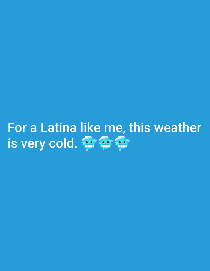 - "The image is a solid blue background with white text that reads, "For a Latina like me, this weather is very cold" by FM-b0Aw43, licensed under CC BY 4.0