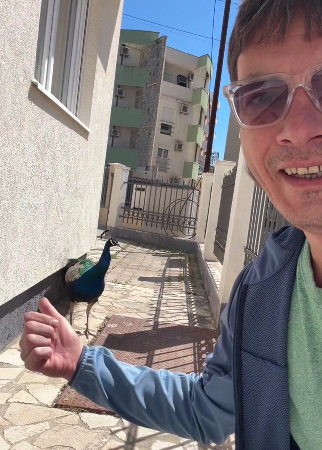 man standing outside in a narrow walkway, wearing sunglasses, a blue jacket, and a green shirt. He is giving a thumbs up to the camera. Behind him, a peacock is walking away from the camera, down the walkway. The walkway is paved with stone and has a metal grate. On either side of the walkway are buildings. The sky is blue and the sun is shining. The man appears to be smiling and happy.