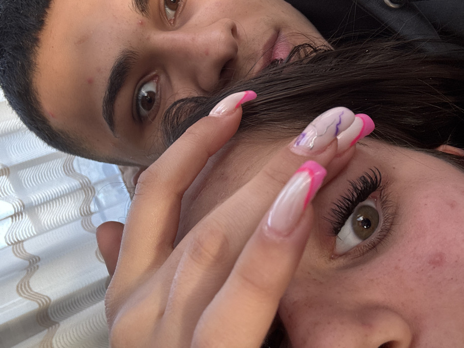 The image displays a close-up of two individuals, primarily focusing on their faces and a hand. In the immediate foreground, the left eye, upper cheek, and part of the nose of a female individual are visible. Her left eye has a brown iris and an apparent dilated pupil, framed by long, dark artificial eyelashes. Her skin exhibits minor blemishes. A light-skinned hand, presumably hers, is positioned in front of her face, with four fingers extended, obscuring part of her forehead and extending towards the second individual. The nails on this hand are long, square/coffin-shaped, and feature acrylic enhancements with French tips. Three visible nails have bright pink tips, while one (the ring finger) displays a light pink tip with abstract purple and silver wavy designs. In the mid-ground and background, partially obscured by the female's hand, is the face of a male individual. He has short, dark hair, dark eyebrows, and visible facial stubble/light mustache. Both of his brown eyes are open wide and appear to be looking directly at the viewer. His forehead and cheek exhibit minor skin blemishes. His lips are slightly parted. He appears to be wearing dark clothing, possibly a hooded garment. The background is out of focus, showing vertical wavy patterns consistent with sheer curtains or blinds, suggesting an indoor setting with natural light source. The specific location within the city of Knezha, Bulgaria, is not ascertainable from the visual information provided in the image.