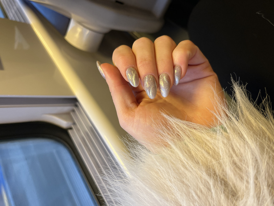 The image presents a close-up view of a person's left hand and lower forearm, set inside a public transport vehicle in Saint-André-lez-Lille, France. The hand has fair skin and five fingers are visible, slightly curled. Each nail is manicured into an almond shape and coated with a reflective, glittery nail polish that shifts from silver to gold, displaying a magnetic or "cat-eye" effect. The lower forearm and wrist are covered by a voluminous, light-colored material with fine, soft strands resembling faux fur or feathers. In the background, a window of the moving vehicle displays a blurred blue and light grey exterior. Below the window, light-colored horizontal slats are visible, part of the vehicle's interior paneling, which appears to be a uniform light cream hue. A dark, possibly black, surface is partially visible in the bottom right corner of the frame, likely a seat or lap.