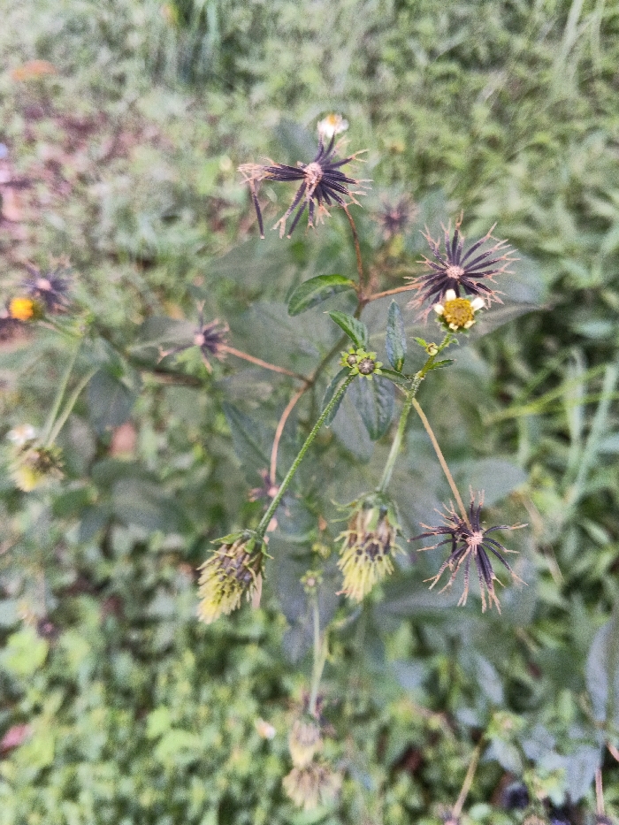 A patch of bidens pilosa, or hairy beggarticks, fills the frame. The plant features dark centers surrounded by yellow flowers and seed pods. Some of the seed pods have developed spiky bristles, characteristic of this plant's method of seed dispersal. The background is a blurred mix of green foliage and ground cover.