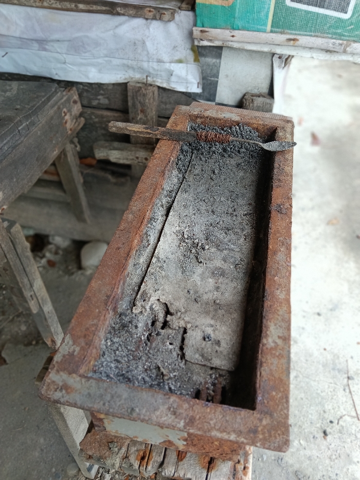 In Keudealuerheung, Indonesia, an outdoor or semi-outdoor scene displays a rectangular, heavily corroded metal trough in the foreground, angled from the upper left to the lower right. The trough's interior contains a substantial quantity of dark grey granular material, consistent with ash or fine charcoal, covering a lighter grey, uneven base, possibly a worn refractory lining or concrete. An elongated, dark-colored object, resembling a rod or tool, rests across the top edges of the trough. One end of this object, positioned towards the upper right, is tightly wrapped with reddish-brown metallic wire. The opposite end, partially submerged in the ash, terminates in a small, flattened, spade-like tip. The trough is visibly supported by rough, weathered wooden planks or beams. To the left of the trough, a haphazard collection of weathered wooden planks and structural elements is visible. In the background, a crumpled white tarp or sheet partially covers other materials, including a green-colored sheet. The ground surface to the right of the trough is light grey, suggesting concrete or compacted earth. No individuals or discernible actions are present.