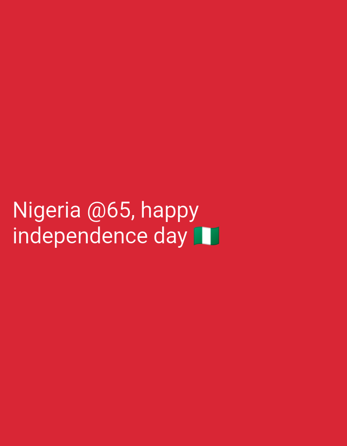 The image displays a solid red background. In the lower-left quadrant, white text states: "Nigeria @65, happy independence day", followed by a Nigerian flag emoji. No individuals are present, and no actions or interactions are depicted. The environment consists solely of the red color and text. The scene is located in the city of Unknown, Unknown.