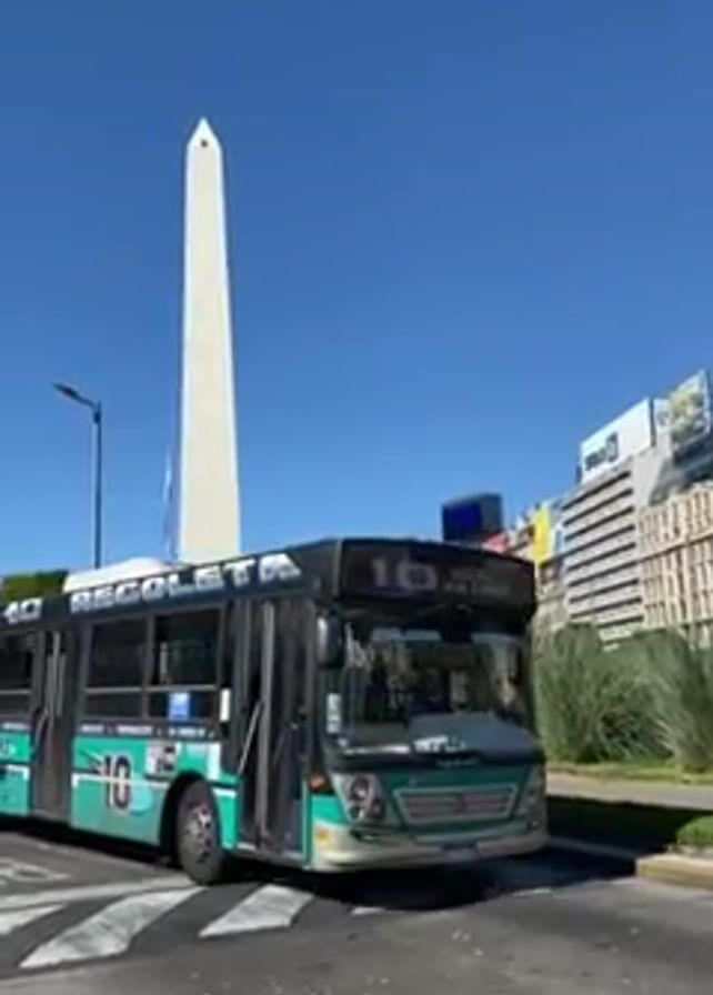 light blue, green and black bus with “10” and other words on it driving away from the camera at a crosswalk with a large white obelisk in the background under a clear, bright blue sky. The grass in the median is green, and some buildings are visible in the background, including one with a large digital billboard on top of it. Several people are visible near the base of the obelisk.