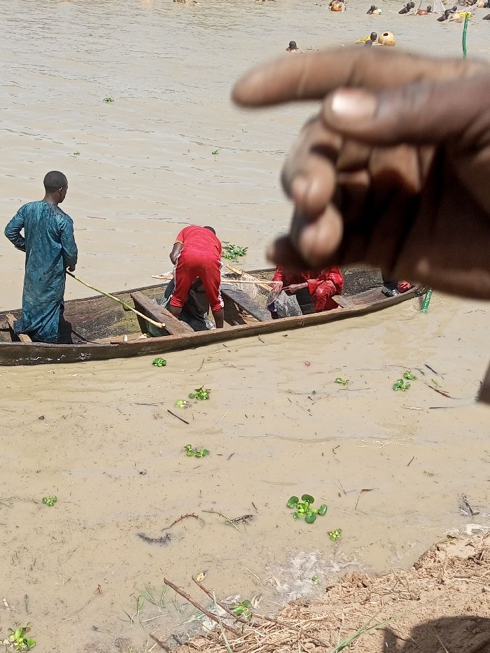 The scene, captured in Kokani North, Nigeria, features individuals engaged with a murky brown body of water