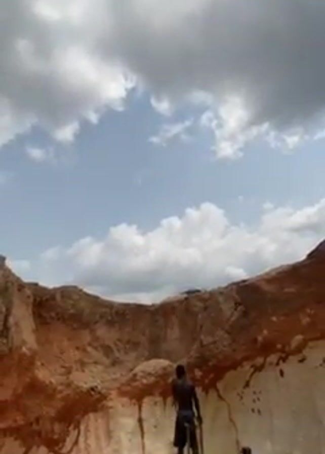 A man is working in a large pit with reddish brown dirt and white sand. He is shirtless and wearing dark shorts. The pit is quite deep with vertical walls. There are a couple of shovels, a pickaxe, and a bucket on the sand near him. The sky above is partly cloudy. The camera angle is low, looking up at the man and the pit.