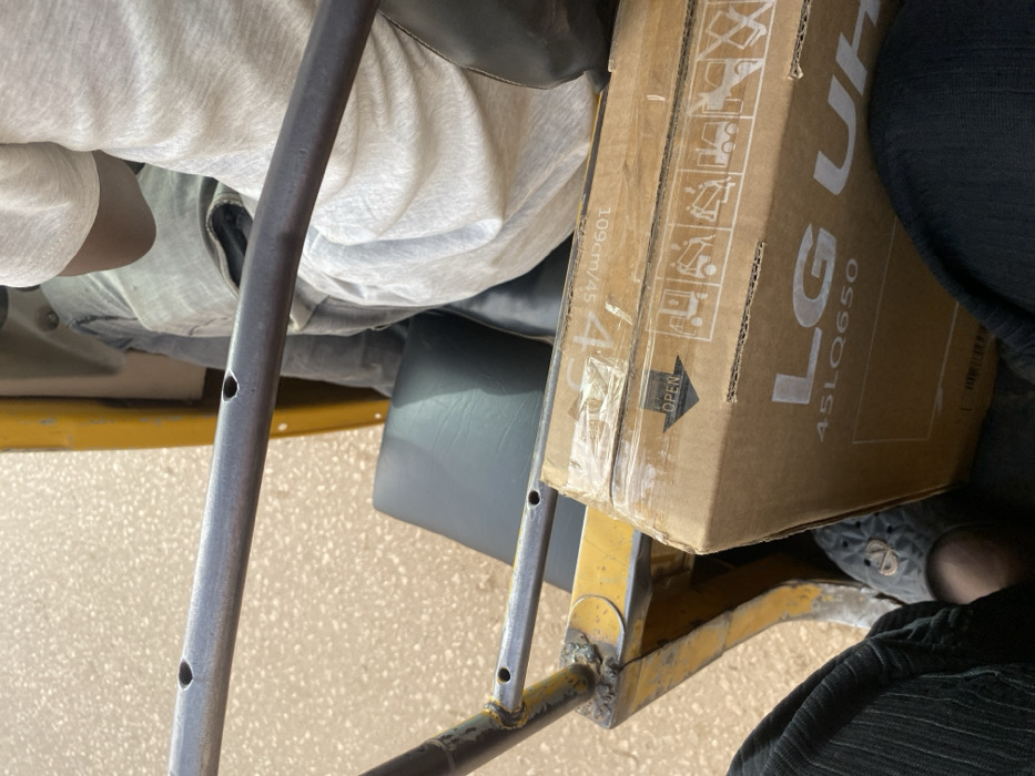 A close-up shot shows the inside of a vehicle, possibly an auto-rickshaw or similar small vehicle. A cardboard box labeled "LG UHD 45LQ650" with an arrow pointing to "OPEN" is visible. Adjacent to the box, a passenger sits, with portions of their clothing and footwear (a Croc shoe) visible. The frame of the vehicle, constructed from metal tubing, is a prominent feature, including visible holes and yellow paint. The vehicle's seat, upholstered in a dark color, is also partially visible.