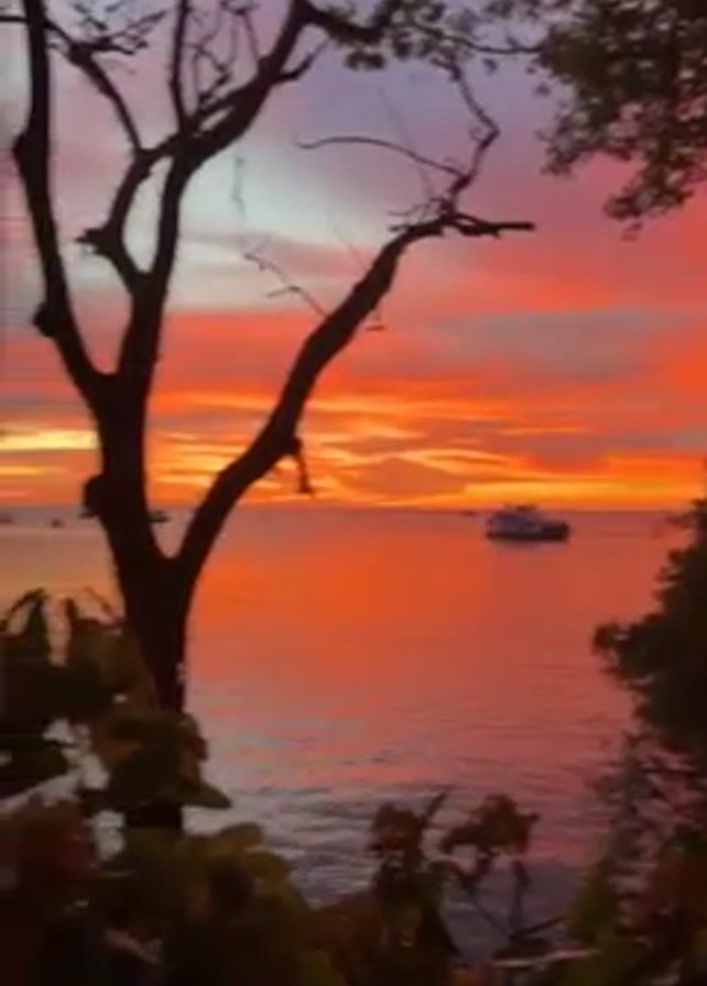 The camera pans from left to right revealing a vibrant sunset over the ocean. The sky is a mix of bright orange, red, and pink hues, with a few clouds visible. A boat is seen on the water in the distance. The foreground is framed by trees with dense foliage and branches. The water reflects the colors of the sky. The environment appears calm and tranquil.