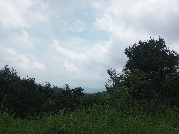 The scene depicts an expansive natural landscape under a partially overcast sky in Vieng Phouka, Laos. The upper two-thirds of the image consist of a cloudy sky, featuring a mix of white and grey stratocumulus clouds with patches of lighter blue visible between them. The horizon is low, with distant, indistinct hills or mountains faintly visible beneath the sky, suggesting a topographical landscape. The lower third of the image is dominated by lush green vegetation. The immediate foreground is covered with tall, unkempt green grass and various herbaceous plants. Behind this foreground vegetation, a dense, continuous line of dark green trees and bushes extends across the midground. On the right side, a large, mature tree with a full canopy of dark green leaves and visible clusters of what appear to be nascent growths or seed pods at its crown stands prominently. On the left side, another cluster of similar dark green trees is present. There are no visible people, animals, man-made structures, or specific actions occurring within the frame. The overall impression is a natural, uncultivated environment during daylight hours.