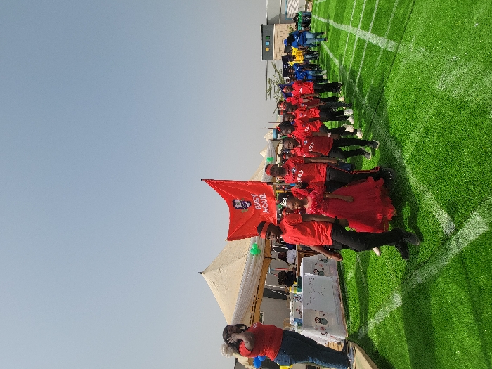 The image captures an outdoor event, identified as taking place in the city of Jos, Nigeria. A procession of approximately fifteen to twenty children walks from left to right across an artificial green turf field, delineated by white lane markings. The majority of the children are uniformly dressed in red t-shirts, black trousers, and some wear red headbands. Prominently featured near the front of the red group is a young girl in a bright red, layered gown and a small tiara, walking alongside a boy in a red t-shirt and black trousers. A large red banner, held upright within the procession, displays white text that reads "SURJ HOUSE" along with a white logo. To the immediate left, an adult female in a red t-shirt and blue jeans stands on a slightly elevated surface, observing the procession. In the mid-ground on the left, several white, peaked tents are set up, adorned with green balloons or streamers, with tables visible underneath. Further in the background, additional groups of children are discernible, wearing different colored shirts such as yellow and blue, indicating other participants. The event occurs under a clear, bright blue sky, with modern buildings visible in the distant background.