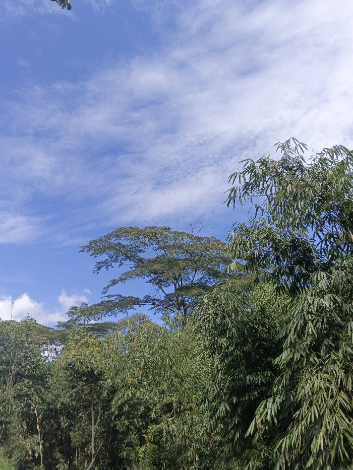 A vibrant blue sky dappled with thin, white clouds serves as a backdrop for lush greenery. Trees with dense foliage occupy the lower half of the frame. A particularly tall tree, distinguished by its umbrella-like canopy, rises above the others. Bamboo with long green leaves is prominent on the right side. Sunlight illuminates the scene, enhancing the colors and textures of the natural environment.