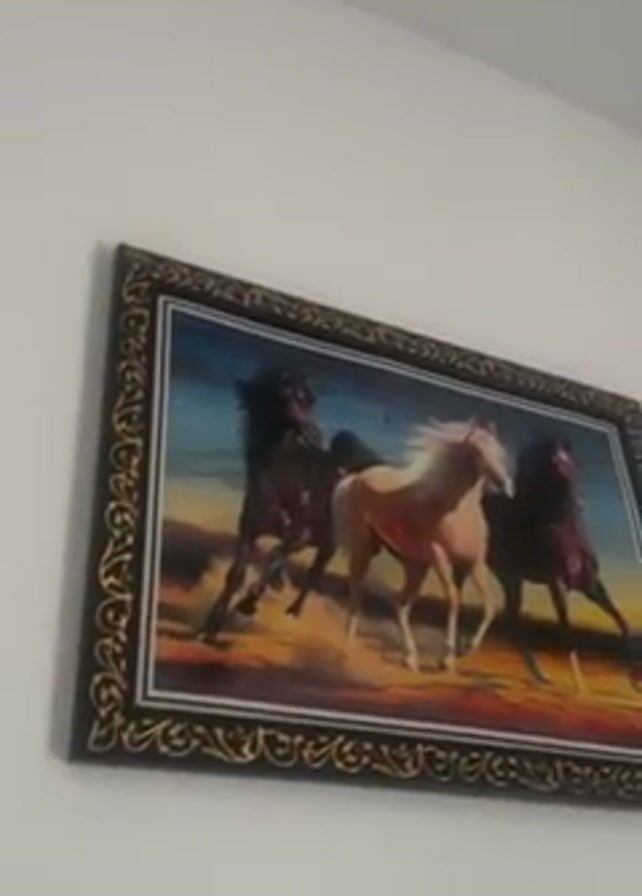 A medium shot shows a painting on a white wall. The painting is rectangular with a decorative black and gold frame. It depicts three horses running: a dark brown horse on the left, a light brown horse in the middle, and another dark brown horse on the right. The background of the painting appears to be a landscape with a combination of earth tones and a blue sky. The camera is positioned below the painting, looking slightly upward. The lighting is even and bright.