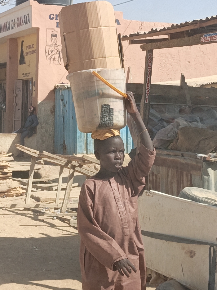 A full-length, eye-level outdoor photograph depicts a young person carrying a stacked load on their head, observed in Hotoro South, Nigeria, under a clear, sunny sky