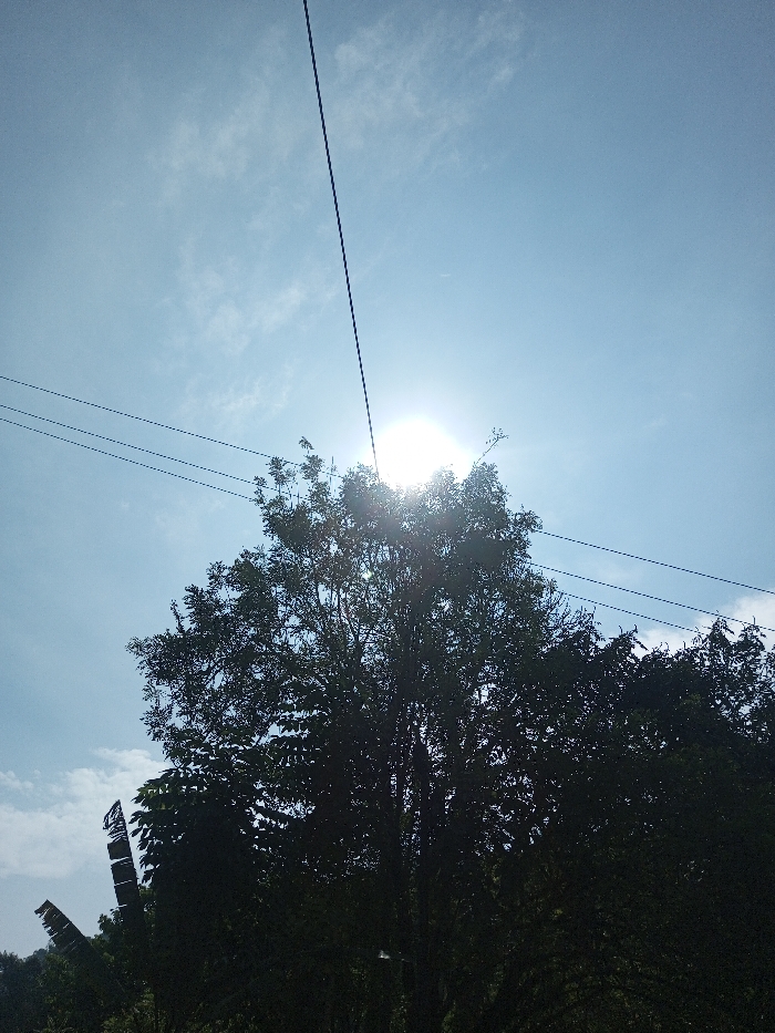 Sunlight shines through a leafy tree against a bright blue sky with wispy clouds. Electrical lines cut across the upper portion of the frame, intersecting near the sun's position. The tree's foliage is dense and dark, obscuring much of the background. Other trees are visible at the bottom of the image.