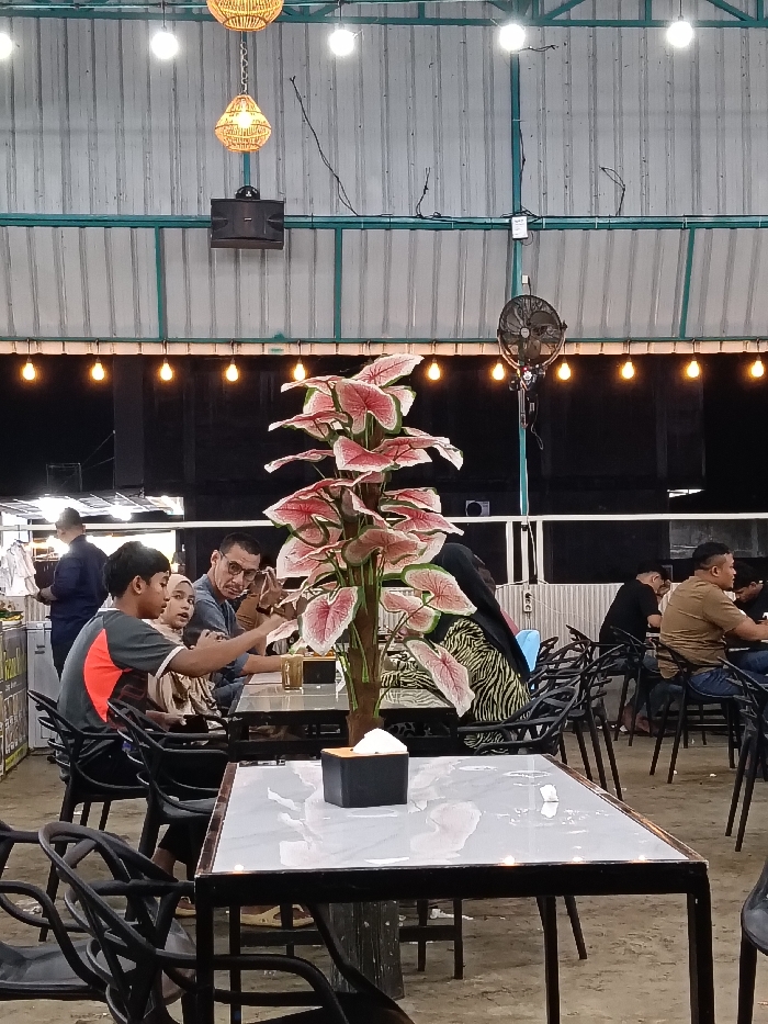 The scene depicts an active, semi-outdoor dining establishment at night, located in Namplohbaro, Indonesia