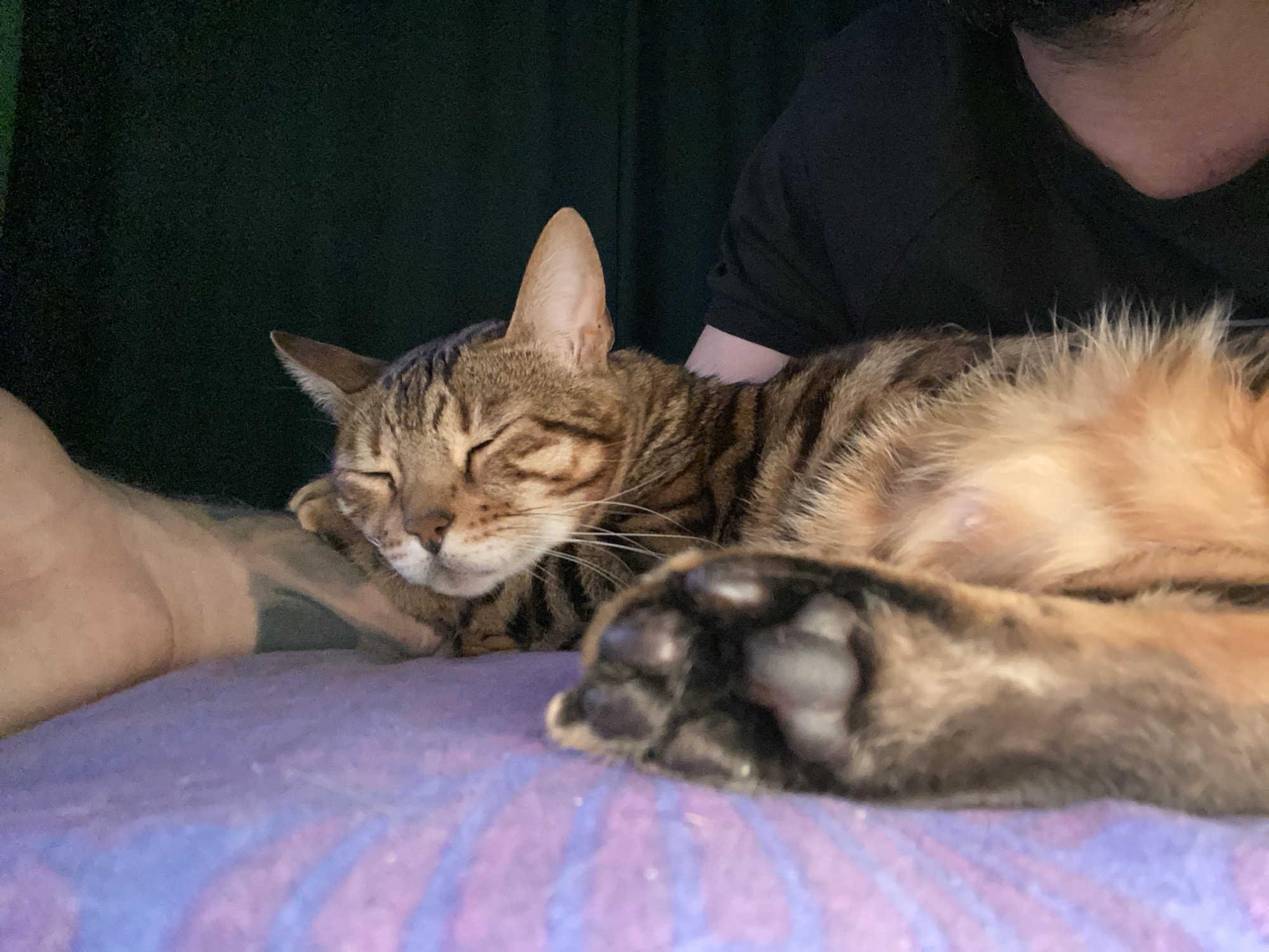 - "A close-up shows a brown, tabby cat sleeping on a purple and light blue patterned surface" by FM-2nUQI2, licensed under CC BY 4.0