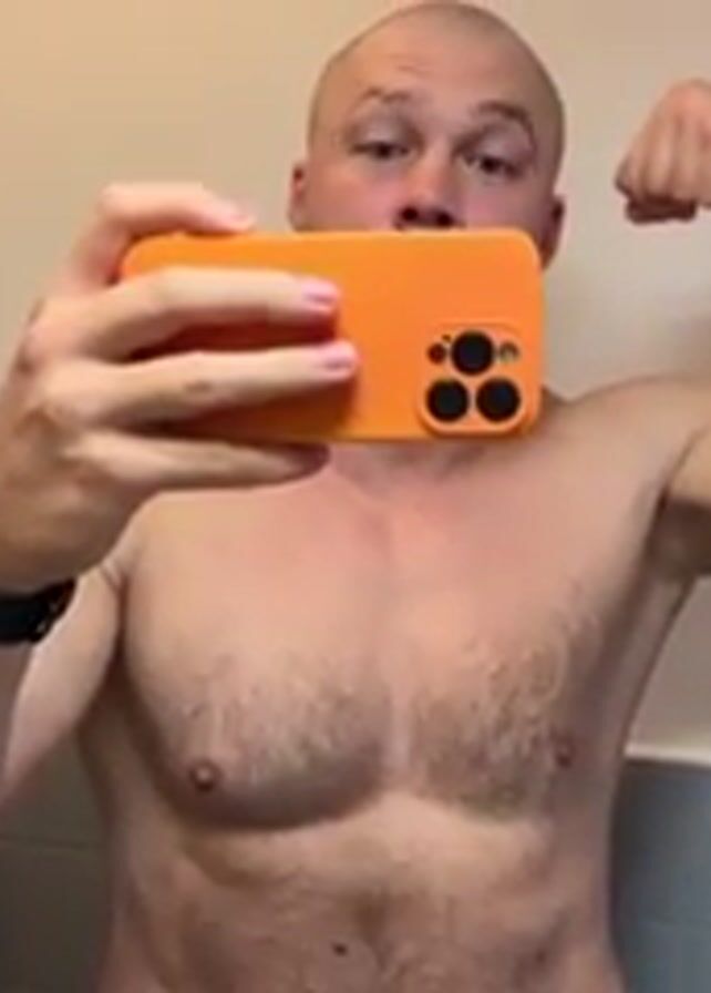 A shirtless, bald man takes a mirror selfie in what appears to be a bathroom