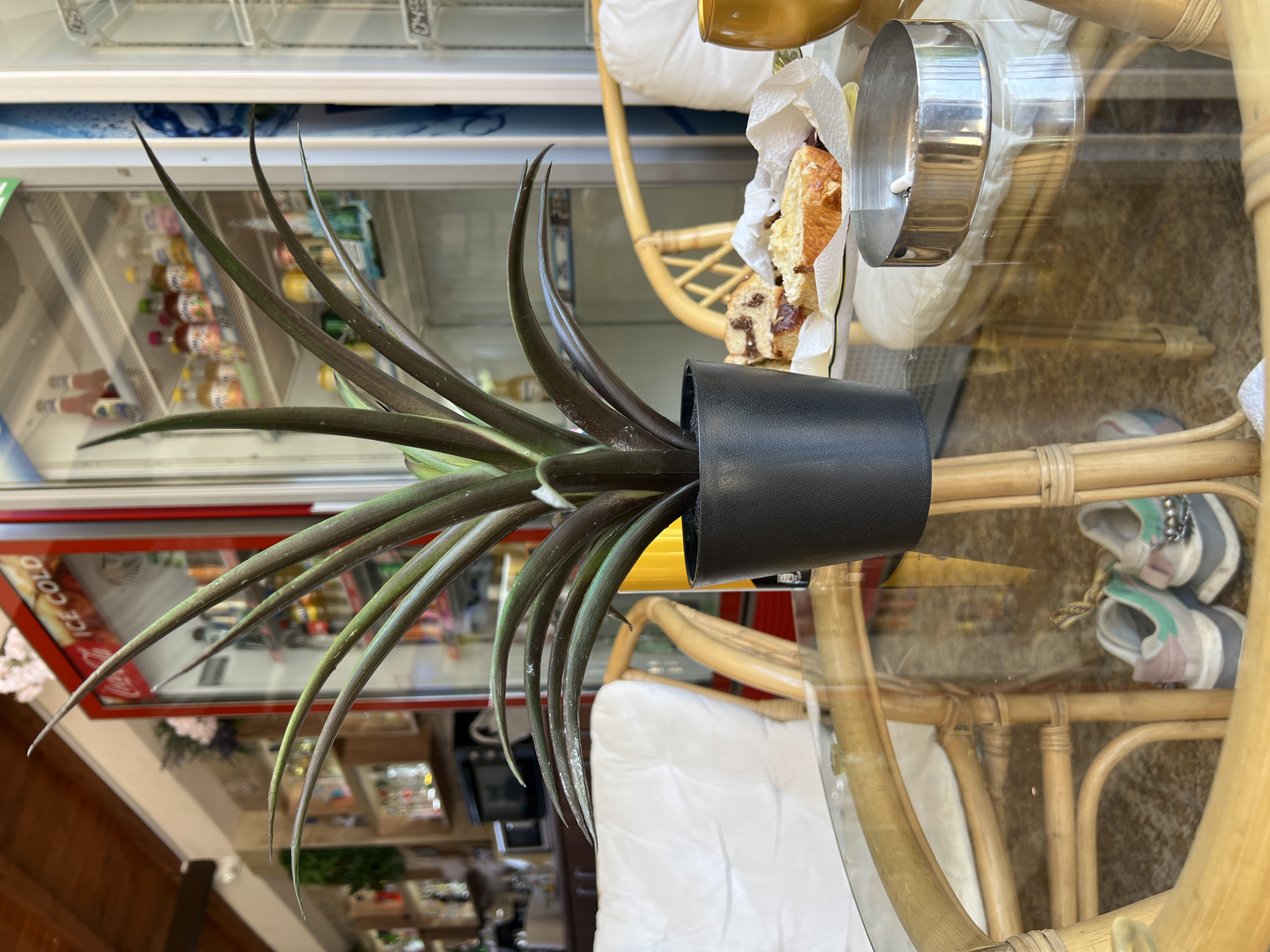 A sideways, eye-level shot captures a glass-topped table with a black pot containing a spiky, green-tinged, dark plant