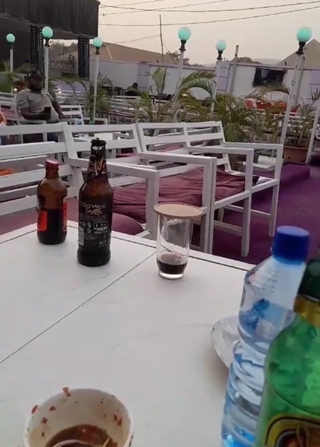The camera is static and focused on a white table covered with empty bottles of Guinness, malt beverages, water, and a small dish with leftover stew. A glass with some liquid inside is also on the table. In the background is an outdoor seating area with white chairs and tables, as well as palm trees in planters. Two people sit at tables in the background. The sky is an overcast grey, suggesting it is either dawn or dusk. Music plays in the background.