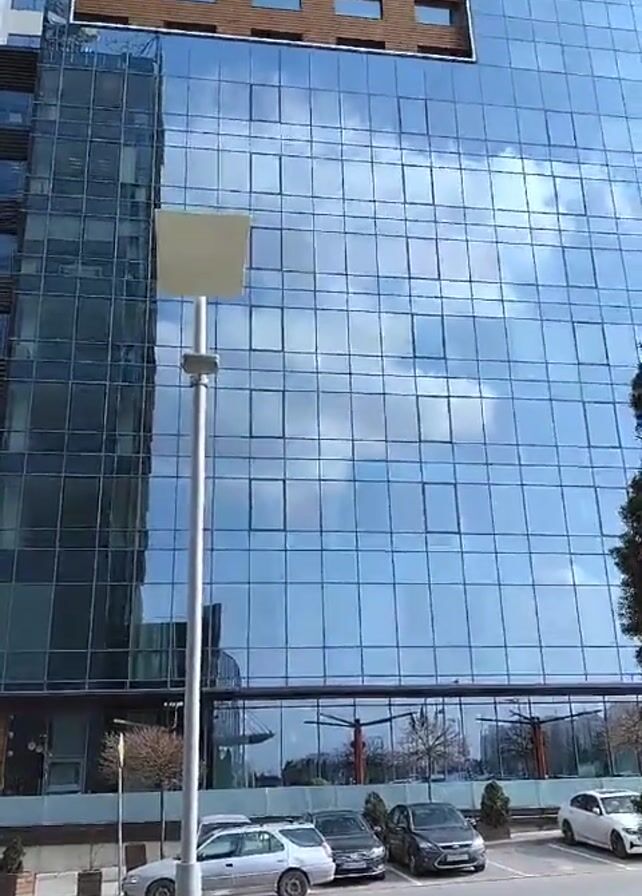 exterior of a tall, modern building with a glass facade, reflecting the sky and clouds. The building has a rectangular section at the top with a wood-like finish and several windows. In front of the building, there is a green lawn with a hedge and several parked cars along a curb. A street lamp stands in the foreground. The weather appears sunny.