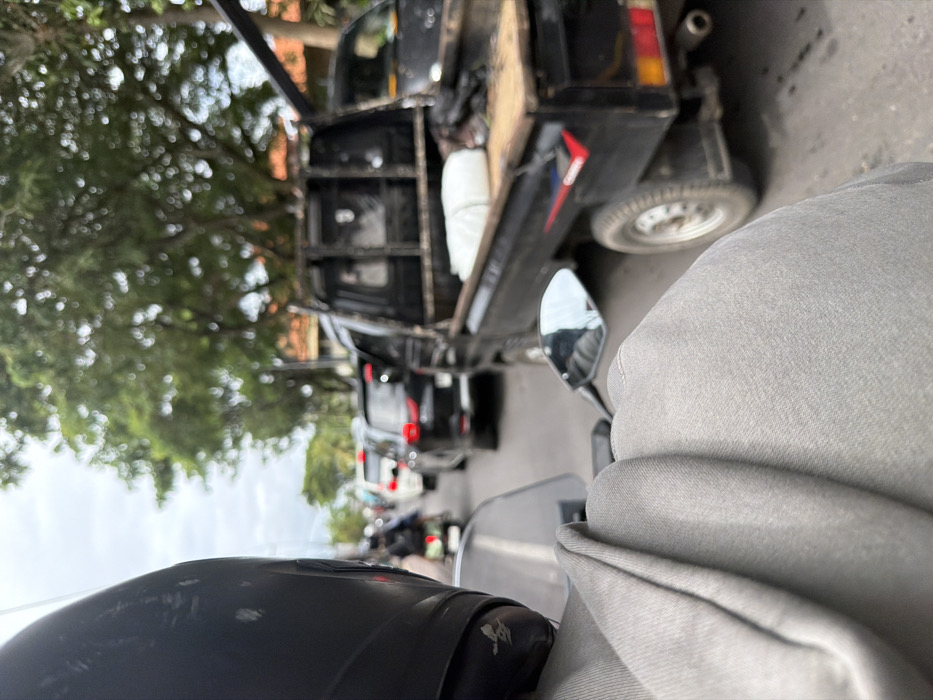 A rider's perspective on a busy street. A black helmet is partially visible at the bottom left, hinting at a motorcycle ride. A gray garment covers the lower right quadrant, possibly the rider's clothing. A black truck filled with white objects is to the right and slightly ahead. Other vehicles, including cars with visible red taillights, are in the distance. A rearview mirror extends from the motorcycle. Trees and a cloudy sky are visible at the top left.