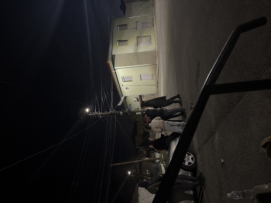 An image captured at night in Marinka, Bulgaria, depicts a street scene with a group of individuals, a parked vehicle, and a building