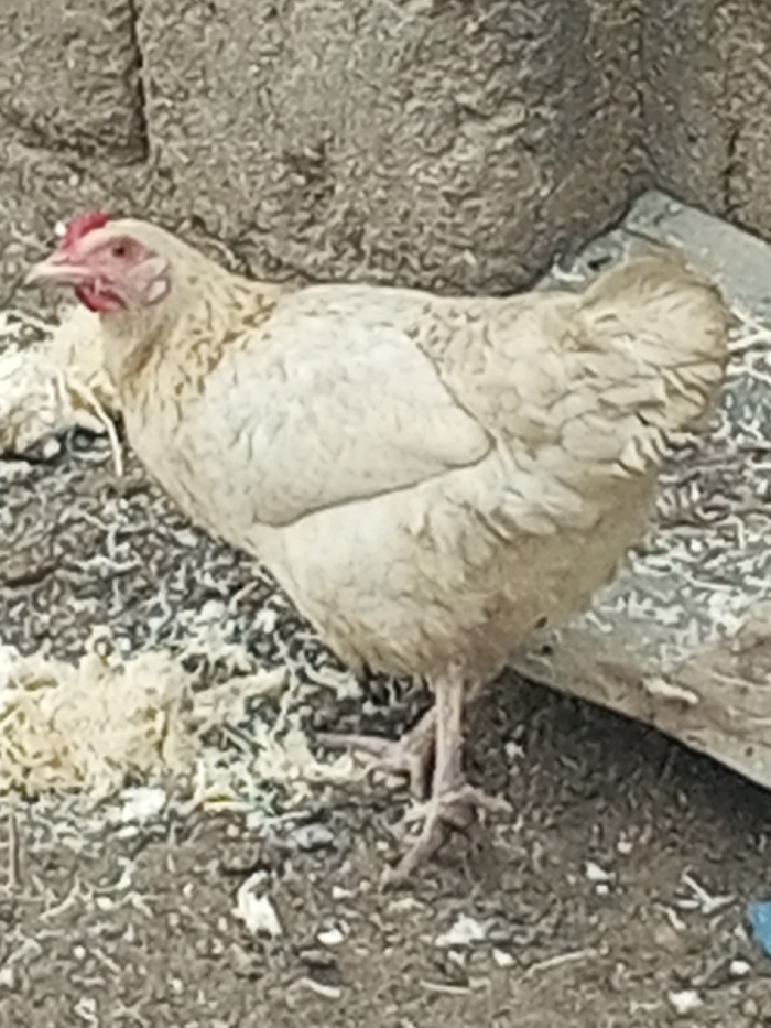 A chicken stands on a dirt and wood shaving-covered ground. The chicken is predominantly white with hints of brown in its plumage. Its head features a red comb and wattle, contrasting with its pale beak. Behind the chicken, a large, rough, grayish object or structure serves as a backdrop. The overall scene appears to be an outdoor enclosure or farmyard.