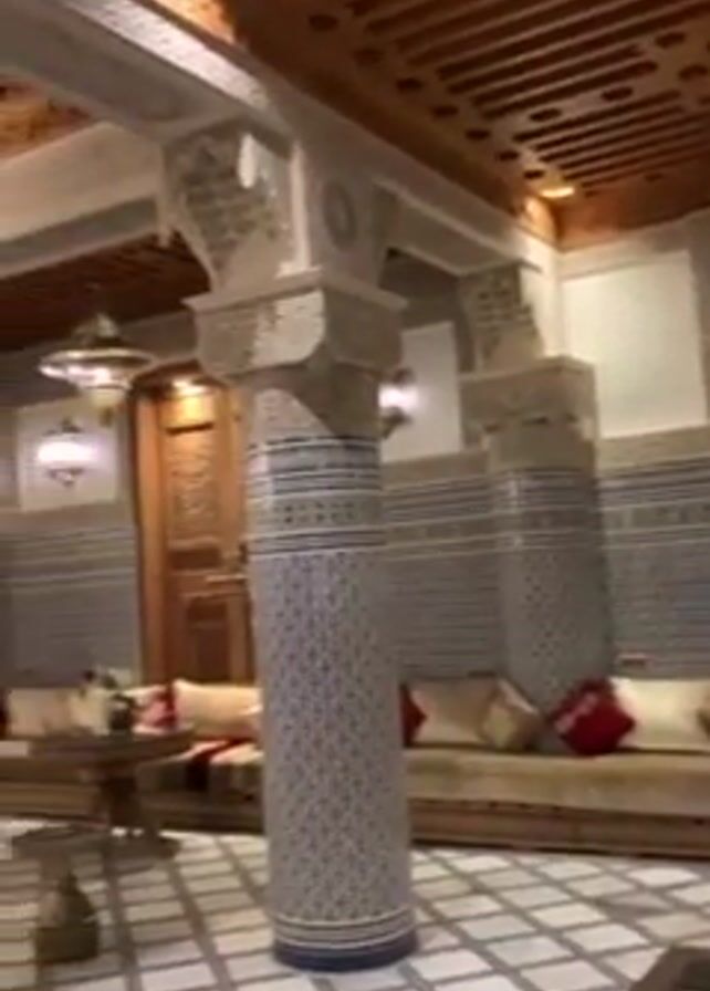 interior of a building with a traditional Moroccan style. The room features elaborate tile work, decorative columns, wooden ceilings with intricate designs, and ornate chandeliers. Seating areas with cushions and low tables are arranged around the perimeter. The floor is tiled in a checkered pattern. Stained glass windows add a splash of color to the space. The overall impression is one of opulence and cultural heritage.