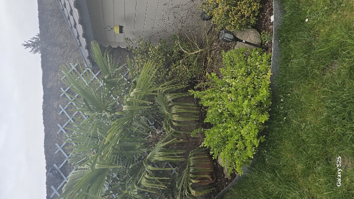 This image depicts a garden scene in Ottonville, France, under an overcast sky. The foreground features a manicured lawn of green grass. A dark grey garden edging separates the lawn from a planted bed. The midground contains a prominent palm-like plant with multiple trunks and large, green fan-shaped fronds, some appearing droopy. Two terracotta pots are partially visible beneath the palm. To the right of the palm, a dense, bright green bush is present, along with a sparser shrub with yellowish-green foliage. A black solar-powered garden light resembling a torch is staked into the ground near a large grey rock in the planted area. The background features a dark, thatched-style fence or wall, adorned with a light blue or grey lattice trellis. To the right, a portion of a light grey building with horizontal siding is visible, topped by a grey tiled roof. A yellow wasp trap hangs from the roof overhang against the building wall. Above the fence and roofline, the sky is uniformly light grey and overcast. A single conifer treetop is visible against the sky in the upper right quadrant. No individuals or active interactions are present in the scene.