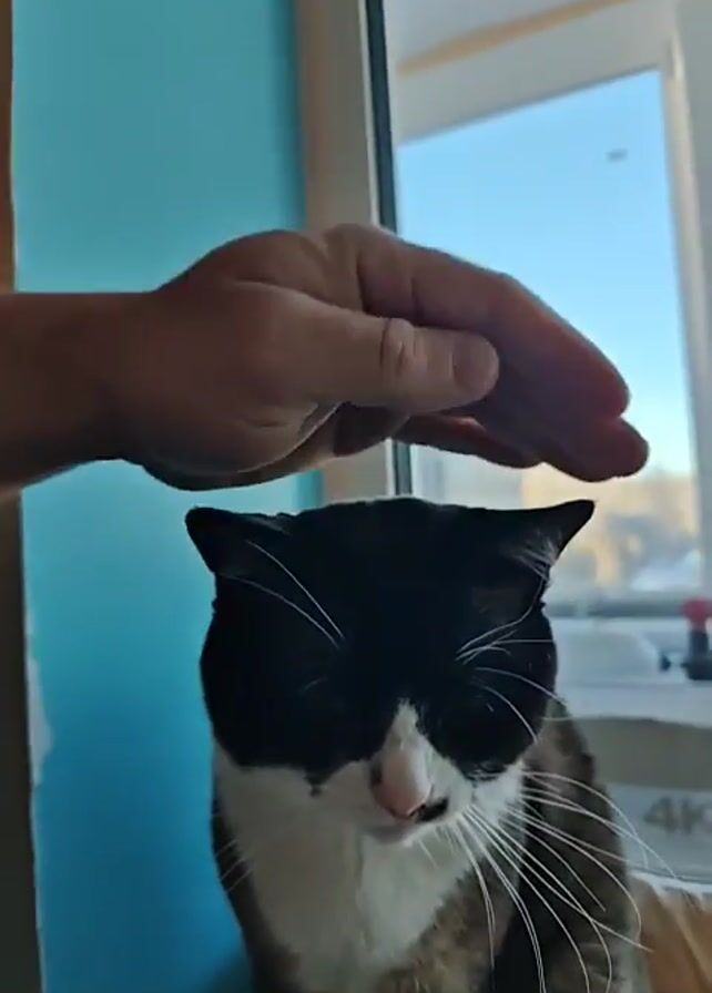 A hand strokes the top of a cat's head. The cat has black fur on its head and back, with a white chest, face, and whiskers. A dark vertical line appears on its face, just right of center. The hand is white, and the person wearing it is not completely visible. The cat is positioned near a window, with a turquoise wall to its left. The view outside the window suggests a bright, sunny day. A "4K" logo is partially visible in the lower right corner of the frame.
