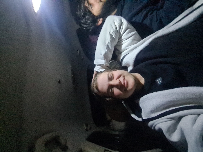 A low-light image depicts two males seated inside a vehicle. The primary subject, positioned in the foreground, center-left, is a male with light-colored hair, a light complexion, and a slight smile, looking directly towards the camera. He wears a dark long-sleeved shirt and a light-colored hooded jacket with dark trim; his right hand is resting on the back of his head. To his right and slightly behind him, a second male with dark, curly hair and a beard is partially visible from the chest up, facing towards the right side of the frame. He wears a dark garment. The vehicle's interior ceiling and an overhead light source, emitting a glow from the upper right, are visible. The specific location within Barza Municipality, Syria, cannot be determined from the visual evidence in the image.