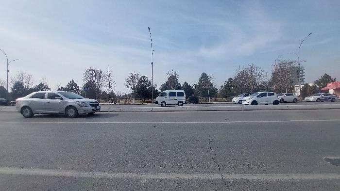 The image displays a daytime street scene in Fergana City, Uzbekistan, under a clear to hazy blue sky. The foreground consists of a multi-lane asphalt road with visible white lane markings and minor surface cracks. On the left side of the immediate foreground, a silver Chevrolet Cobalt sedan is positioned, appearing stationary or parked alongside the road. Separating the foreground road from a parallel roadway is a median strip landscaped with various deciduous trees, some bare and some with sparse foliage, interspersed with evergreen trees. A tall street light pole with a black-and-white striped section is centrally located within the median. On the far side of this median, a white minivan, consistent with models like a Chevrolet Damas, is parked parallel to the road. Further right, along the same side, several additional vehicles are parked or stationary, including two white hatchback cars (one identifiable as a Chevrolet Spark), a white sedan, and a white patrol car with a blue stripe and text on its side. In the background, beyond the trees, a multi-story building under construction is visible, characterized by exposed concrete and rebar structures. To its right, a low-rise building with a distinctive red roof is partially observed. No identifiable individuals are visible in the scene, and no overt actions or interactions are occurring between the stationary vehicles or objects. The environment is urban, suggesting a main thoroughfare.