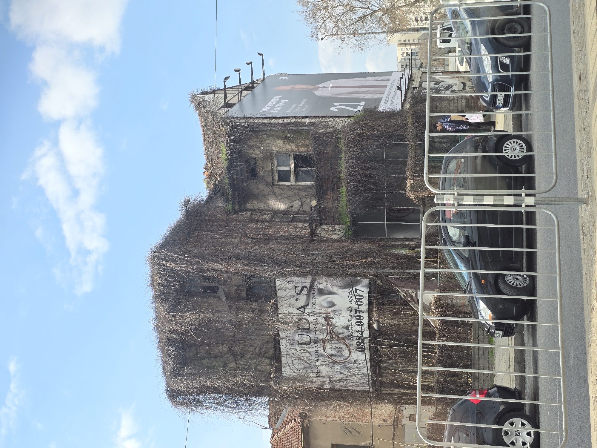 The image displays a street scene in Plovdiv, Bulgaria, on a clear day with a blue sky and scattered white clouds. The central subject is a multi-story, severely dilapidated building on the right side of the street. Its entire facade and roof are heavily overgrown with dense, dry, brown vines, obscuring much of its structure. The roof exhibits significant damage, with visible exposed beams and missing tiles. Windows on the upper floors appear broken or boarded. Mounted on the building's facade is a large, faded white sign that reads "BUDA'S RESTAURANT BAR LOUNGE" in stylized script, accompanied by a graphic and the phone number "0884 007 007". To the right of this, a vertical billboard is affixed to the building, featuring a photographic image of a man in a white shirt and red tie, positioned next to the large number "21" and displaying text in Bulgarian. In the immediate foreground, a white metal temporary barrier extends horizontally across the lower portion of the frame. Behind this barrier, a street runs parallel to the building, with three cars parked along the curb. From left to right, these include a partially visible black hatchback, a black small car (possibly a Daewoo Matiz or similar model), and a blue hatchback with a visible Bulgarian license plate "PB 6701 XX". One individual is visible on the sidewalk, partially obscured by the parked black small car and the blue hatchback. This person, wearing a patterned top, is walking towards the right, carrying light-colored bags. In the background to the right, bare trees, a streetlight pole, and modern multi-story apartment buildings are discernible.