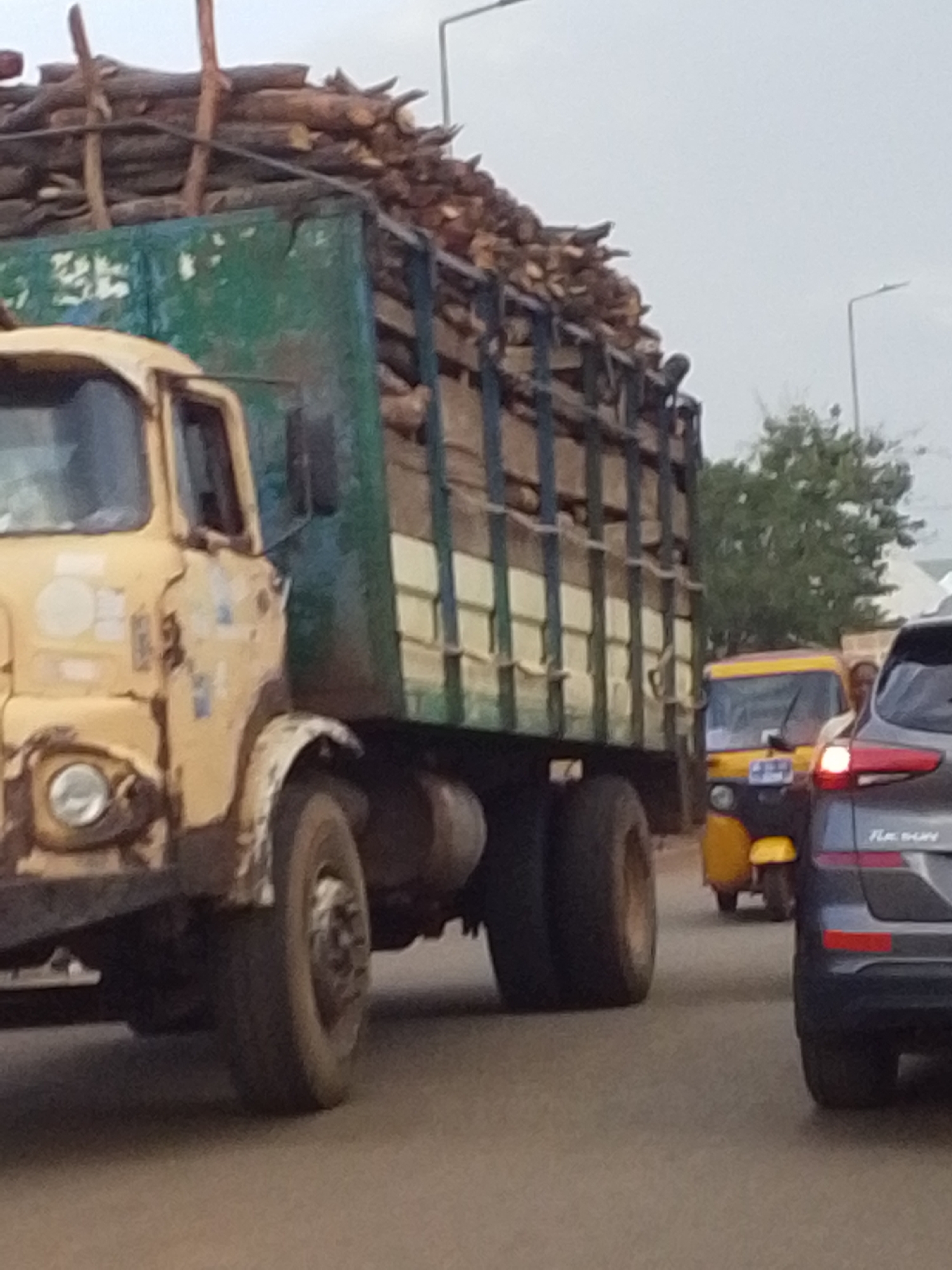 A heavily loaded, weathered yellow and green truck filled with wood sits in traffic in what appears to be Tamale, Ghana. The truck is the main subject, with the wood extending well above the truck bed. The truck is positioned on the left side of the frame. To the right, behind the truck, a yellow and black "auto rickshaw" (tuk-tuk) and a gray passenger car are also in the traffic. A tree and lampposts are visible in the background. The sky is overcast.
