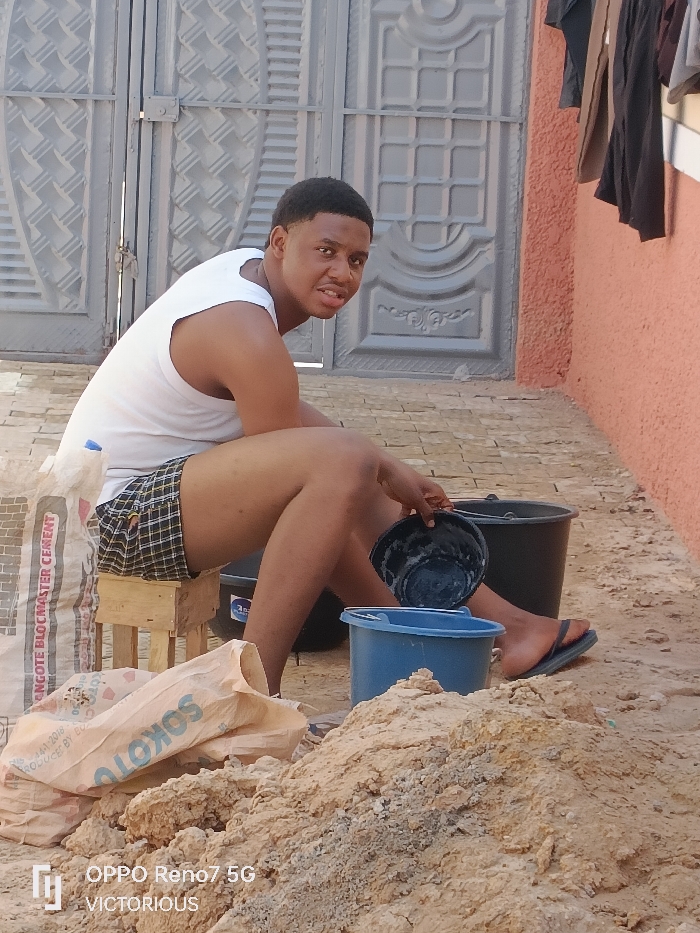 This image depicts an outdoor scene in Dutse, Nigeria, featuring a single young adult male. The individual, with short dark hair and a dark complexion, is seated on a small, light-colored wooden stool. He wears a white sleeveless top, plaid shorts, and black flip-flops. His gaze is directed towards the camera. In his right hand, he holds a small, black bowl over a blue plastic bucket. Two additional dark plastic buckets are visible behind the blue one. To his left, a large white bag labeled "DANGOTE BLOCKMASTER CEMENT" rests on the ground next to a partially visible "SOKOTO" brand bag. A pile of light brown sand or aggregate is present in the foreground and near the cement bags. The background features a large, closed grey metallic gate with patterned details. To the right of the subject, an orange-painted wall is visible, with dark clothing items hanging from a fixture on its surface. The ground is paved with light-colored rectangular bricks.